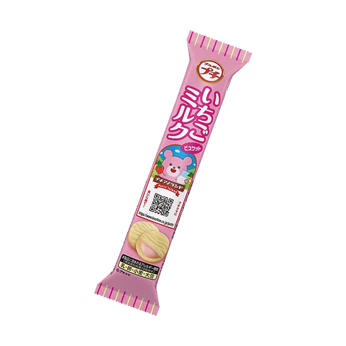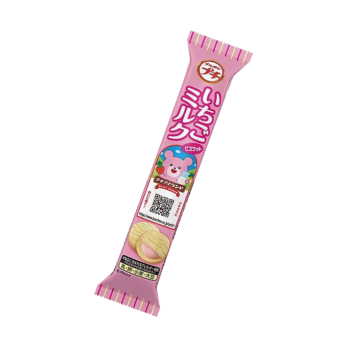 小麦粉(国内製造)、ショートニング、砂糖、加糖練乳、乳糖、ぶどう糖、全粉乳、いちご粉末、食塩、クリーミングパウダー(乳成分を含む)、ココアバター / 膨脹剤、酸味料、乳化剤(大豆由来)、香料、着色料(ビートレッド、カロテン)、卵殻未焼成カルシウム(卵由来)