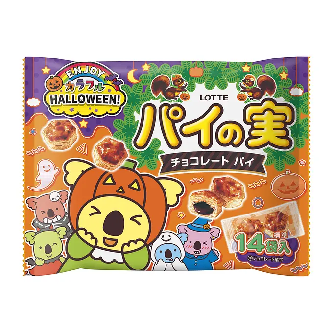 ハロウィン限定のパイの実シェアパックです。ハロウィンらしい雰囲気がいっぱいのデザインで、季節の楽しさを盛り上げます。