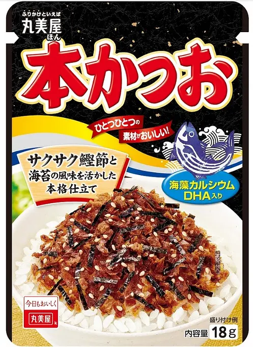 鰹削り節(日本製造)、いりごま、醤油、砂糖、食塩、のり、パーム油、エキス(鰹節、酵母、椎茸)、みりん、鰹、鰹節粉、海藻カルシウム、発酵調味料、デキストリン、でん粉、還元水あめ、DHA含有精製魚油、植物性たん白、生姜ペースト/調味料(アミノ酸等)、カロチノイド色素、酸化防止剤(ビタミンE、ローズマリー抽出物)、(一部に小麦・ごま・大豆を含む)