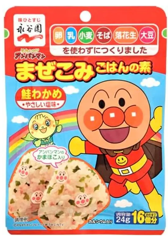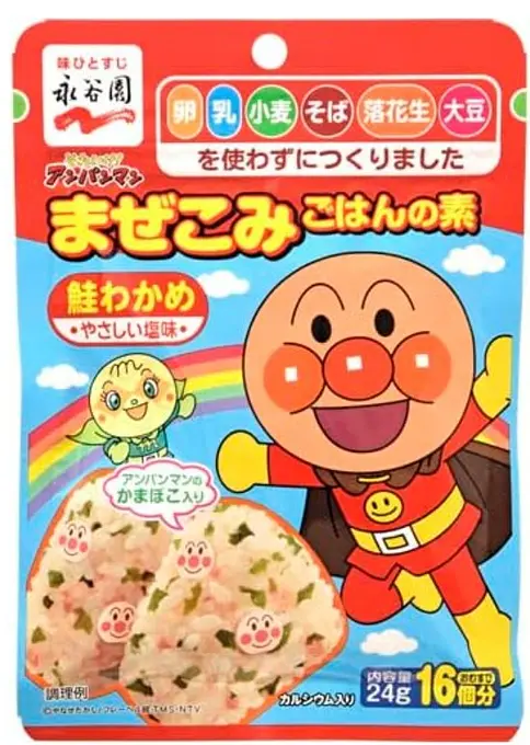 「卵・乳・小麦・そば・落花生・大豆」を使用していないまぜこみごはんの素です。 具はわかめと鮭に加え、楽しく食べられるアンパンマンのかまぼこ入りです。 塩味を控えめにし、やさしい味わいに仕上げました。 うれしいカルシウム入りです。