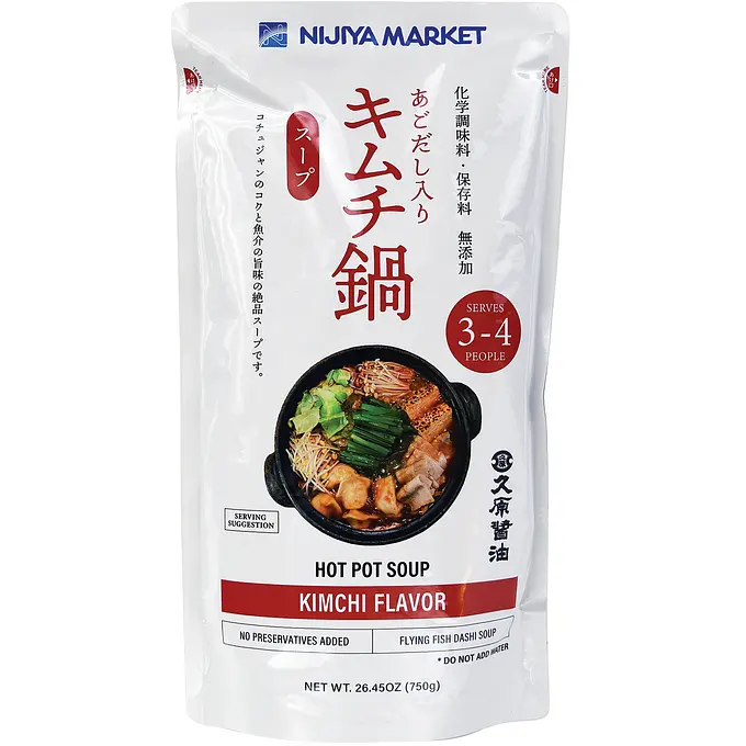 ニジヤの鍋スープ「あごだし入り キムチ鍋」 コチュジャンのコクと魚介の旨味の絶品スープです。 3〜4人前。750g入り。