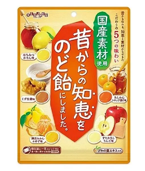砂糖(国内製造)、水飴、濃縮果汁(りんご、みかん、かりん)、生姜汁、ゆず果汁、クリーミングパウダー(砂糖、脱脂粉乳、植物油脂、デキストリン)、はちみつ、金柑ペースト、ビワ葉エキス、金柑エキス、葛でん粉、カラメルソース(砂糖)、りんごペースト、陳皮/酸味料、香料、着色料(カラメル、クチナシ、ウコン、アナトー)、乳化剤