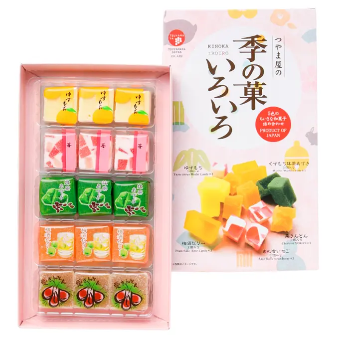 ゆずもち、あわ雪いちご、くずもち抹茶あずき、梅酒ゼリー、栗きんとんの5種の詰め合わせ。