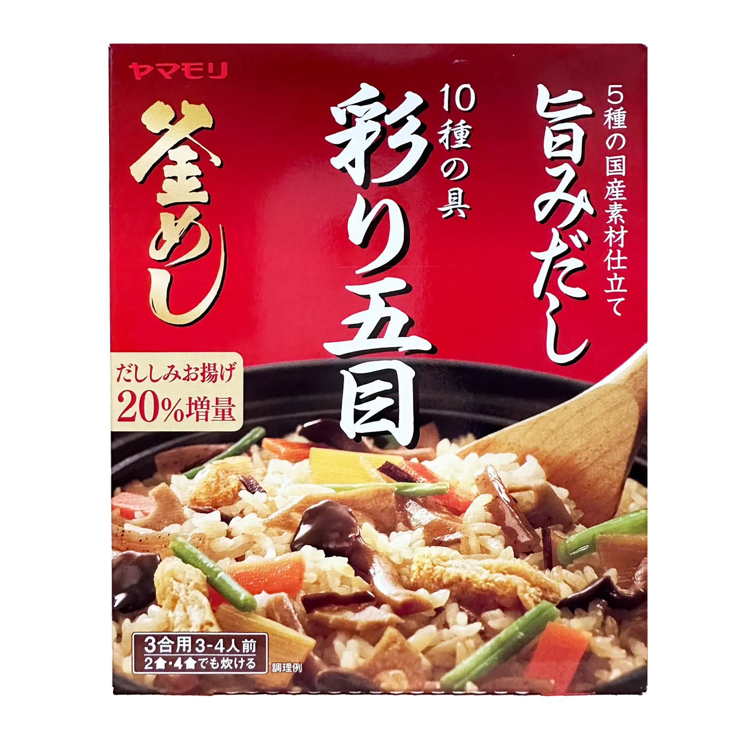 油揚げ、れんこん、きくらげ、しいたけの10種の具材入りの五目釜めしの素です。