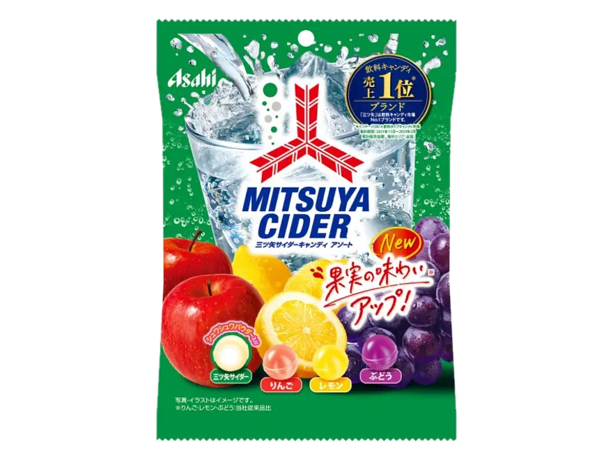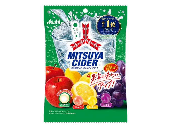 Enjoy the refreshing taste of "Mitsuya Cider" in candy form with our fizzy and invigorating treats. These candies feature a sparkling sensation that replicates the effervescence of the original soda. The assortment includes four flavors: Mitsuya Cider, apple, lemon, and grape. The Mitsuya Cider flavor contains fizzy powder for an extra burst of carbonation.