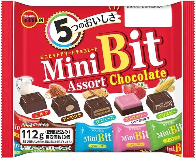 Enjoy five types of chocolate: milk, strawberry, almond, crispy, and wafer.