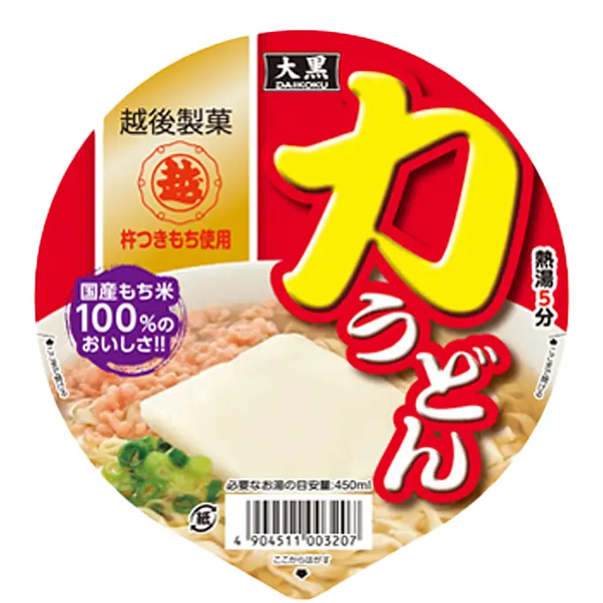 This cup of udon noodles features a refreshing soy sauce broth with bonito and kelp dashi, chewy glutinous noodles, Echigo Seika's mochi (sticky rice cakes) made from 100% Japanese glutinous rice, and colorful fried egg and green onion.