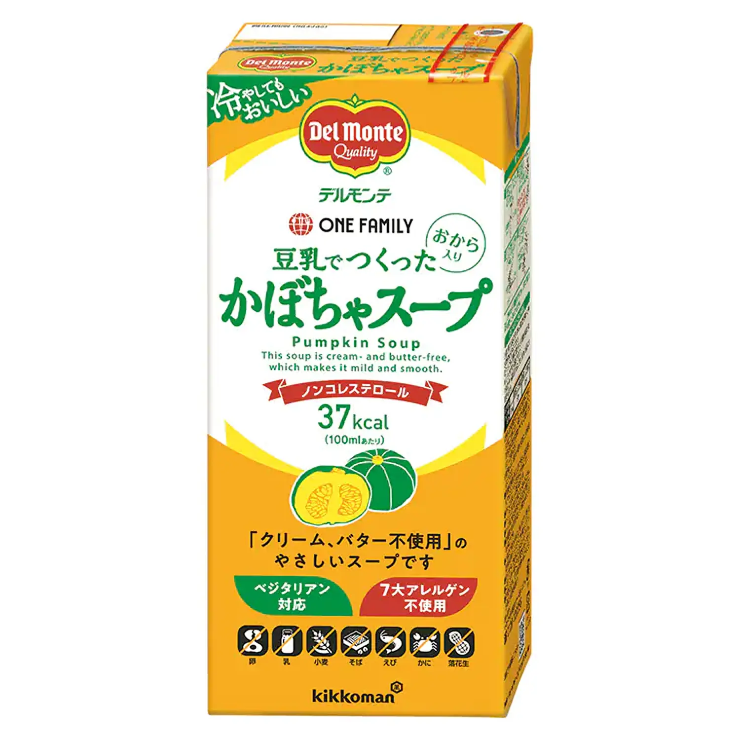 Soy milk (soybeans (Canada or U.S.A.) (sorted and controlled production and distribution)), pumpkin paste, sugar, salt, vegetable oil and fat, powdered okara, fried onions, yeast extract, spices, thickener (processed starch), pH adjuster, emulsifier