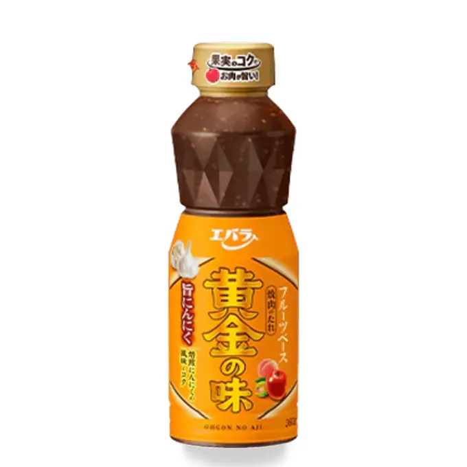"Ebara Ougon No Tare (golden flavor) Garlic" is a rich and fruity yakiniku sauce made from a secret blend of carefully selected apples, peaches, plums, and other ingredients in a golden ratio. The power of the fruit makes the meat taste much better. Enjoy the exquisite harmony of the "golden flavor" with meat.