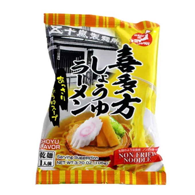 Kitakata Soy Sauce Ramen features thick, flat, curly noodles that have been aged and dried at a low temperature for 48 hours without being fried, a light soy sauce soup with a distinctive flavor, and thick, chewy noodles.