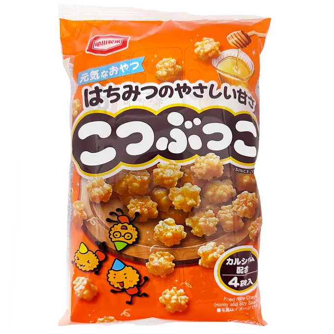 Rice, vegetable oil, soy sauce, sugar, honey, starch, isomaltooligosaccharides, spices, soy sauce powder, salt, processed starch, shellfish calcium, seasoning (amino acid), coloring (caramel, paprika color), trehalose, (contains wheat and soybeans)