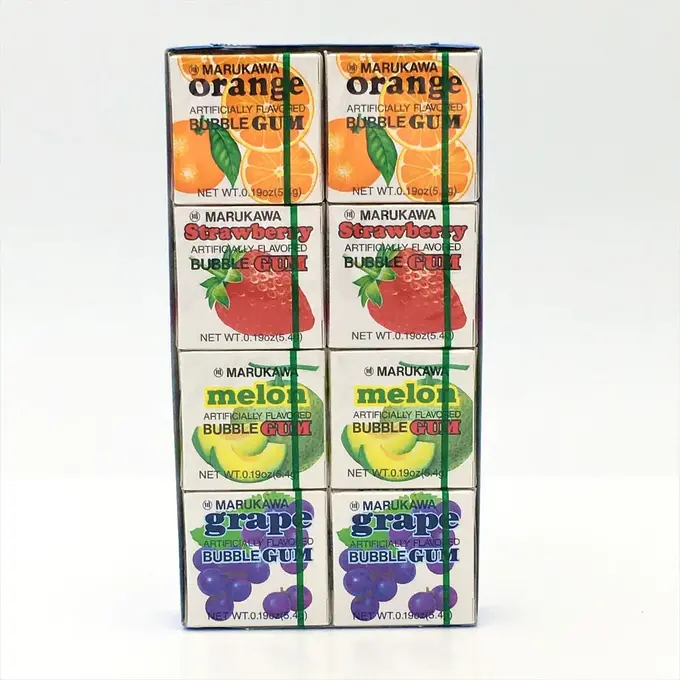 Marble gum is popular for its soft chewing sensation and long-lasting flavor. This set includes orange, strawberry, melon, and grape flavors.