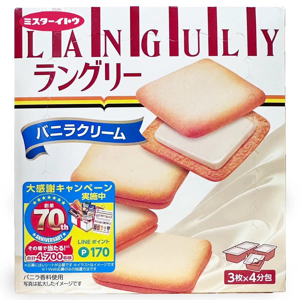 A rich vanilla cream is sandwiched between fine langdosha dough. The brown edges on the edges of the langdosha dough are a sign that the cookies have been baked to perfection. The brown edges on the edges of the langue dough are a sign that it has been baked to perfection.