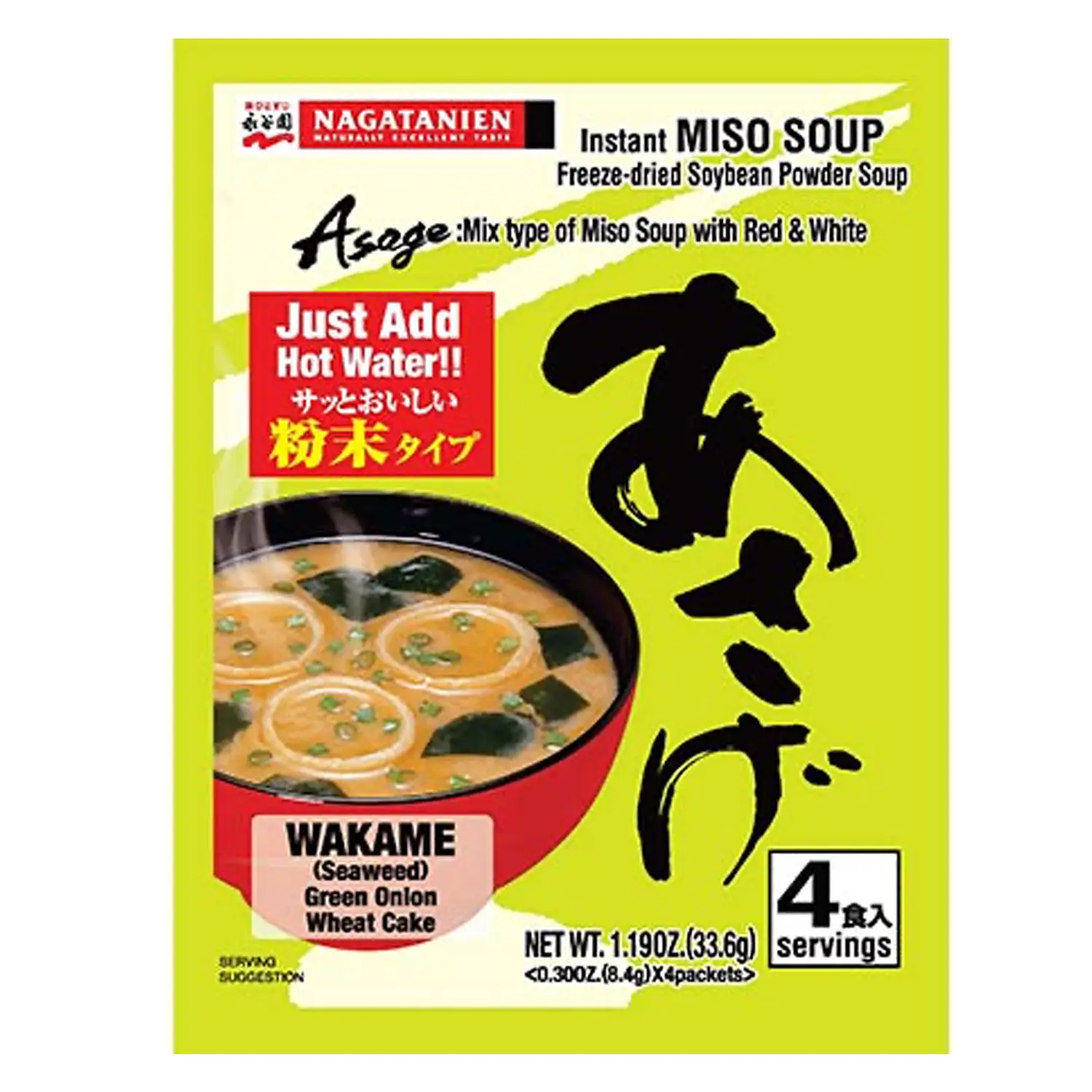 "Asage", a registered brand name of Nagatanien, has been the most popular instant miso soup in Japan. A mix type of miso with red and white is used for "Asage". This powder type miso soup is easy to melt, easy to bring and tasty.