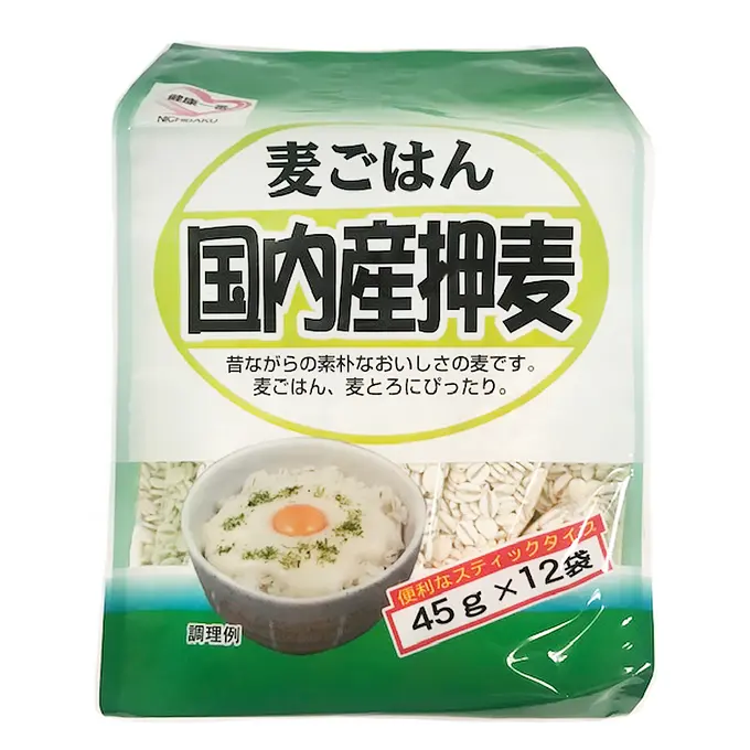 This product is characterized by the black strips in the middle of the barley, which are heated with steam and pressed with a roller after the outer skin of the barley is peeled off. The barley has a traditional, nostalgic taste and is made from Japanese ingredients.