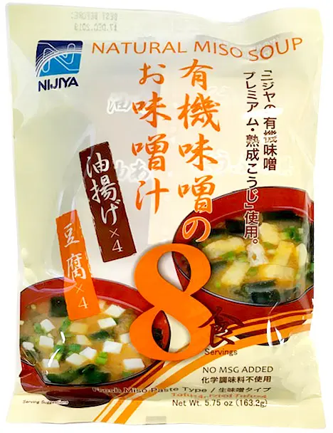 [Ingredients] MISO PASTE:Organic Soybean Paste(Water, Organic Soybeans, Organic Rice, Salt ), Water, Alcohol, Seasoned Kelp Extract(Kelp Extract, Hydrogenated Starch Syrup, Alcohol, Salt, Xanthan Gum), Dried Bonito Powder, Seasoned Bonito Extract(Dried Bonito Extract, Sugar, Yeast Extract, Alcohol), Salt, Dried Frigate Mackerel Powder, Yeast Extract Powder, Sugar, Dried Anchovy Powder.
