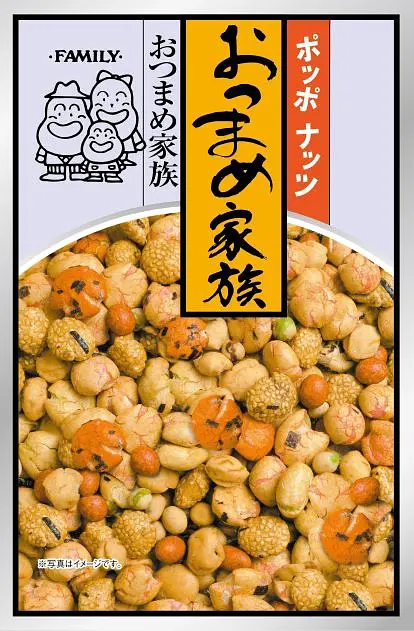 Peanuts (imported), wheat flour, starch powder, green peas, sugar, waxy corn starch, shrimp powder, soy sauce, starch hydrolysate, vegetable oil, salt, cut squid, sesame, seaweed, chili pepper, black pepper, maltose, syrup, seasoning (amino acids, etc.), modified starch, coloring agents (Red No. 3, Yellow No. 4, Yellow No. 5, Blue No. 1, caramel color, annatto extract), leavening agent, flavoring, (contains peanuts, wheat, shrimp, squid, soybeans, and sesame as part of the ingredients)