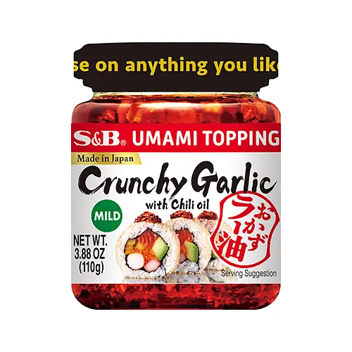 This is a special add-on condiment of chili oil with savory and crunchy ingredients. Chili oil, Fried Garlic and Chili Paste are expertly mixed for exquisite taste and texture, making it a great match for various menus. Heat level classifies as mild.