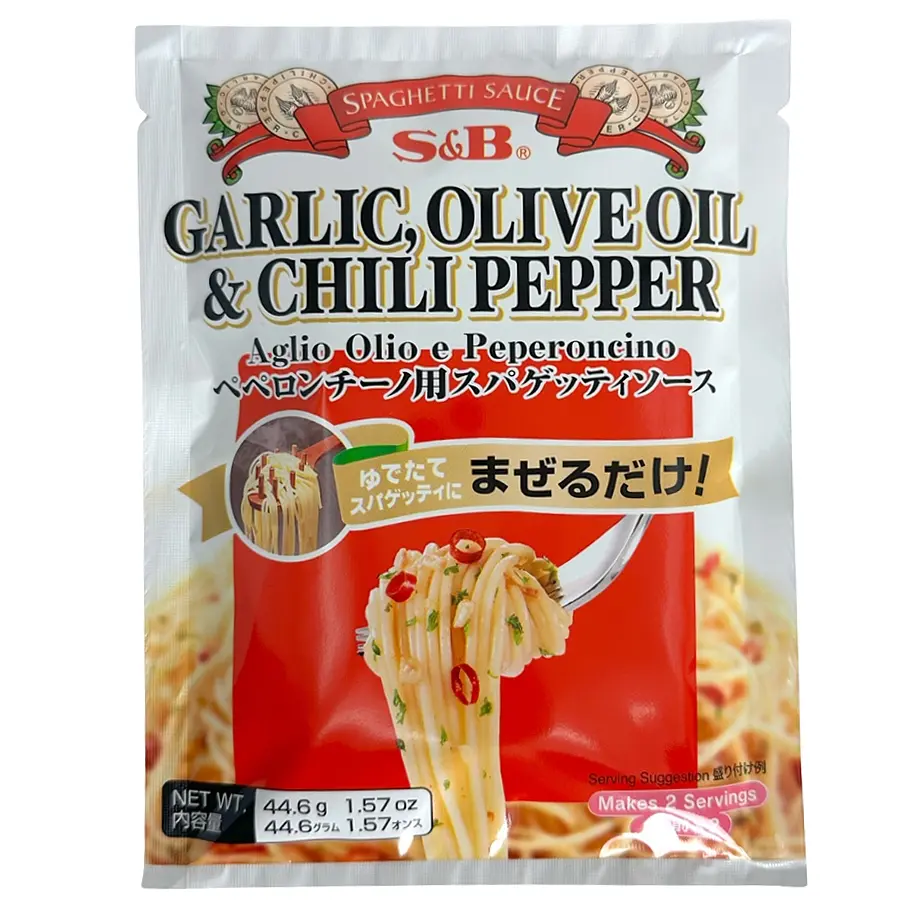 You can make delicious pasta dish with just mixing this pasta sauce with cooked pasta. It is a pasta sauce based on olive and garlic oil with well-roasted garlic and chili flavor. It contains topping packet of fried garlic, parsley, chili pepper that bring the color and flavor. One pack contains two servings. Not only for pasta, you can also use for vegetable, chicken and seafood sauté and garlic fried rice.