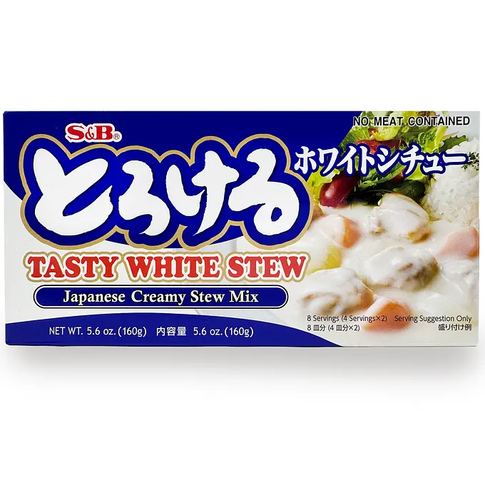 ”White stew” is a dish of stewed meat and vegetables with white sauce, cream or soymilk. This is a block form stew mix made of wheat flours, spices, seasonings, oil and vegetable powder. Simply stir-fry meat and vegetables of your choice, add water and this mix in, stir as they dissolve, add milk and simmer. You can cook a tasty white stew very easily.