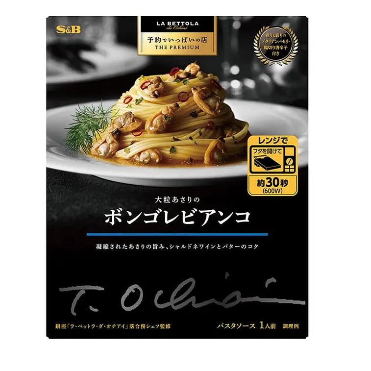 "Vongole Bianco" is a pasta sauce supervised by Chef Ochiai, the owner and chef of "La Bettola da Ochiai", a popular restaurant in Ginza, known as a "restaurant full of reservations" and a highly praised Italian chef by Italians living in Japan. Rich and aromatic flavor of scallion juice combined with olive oil. Comes with parsley topping.