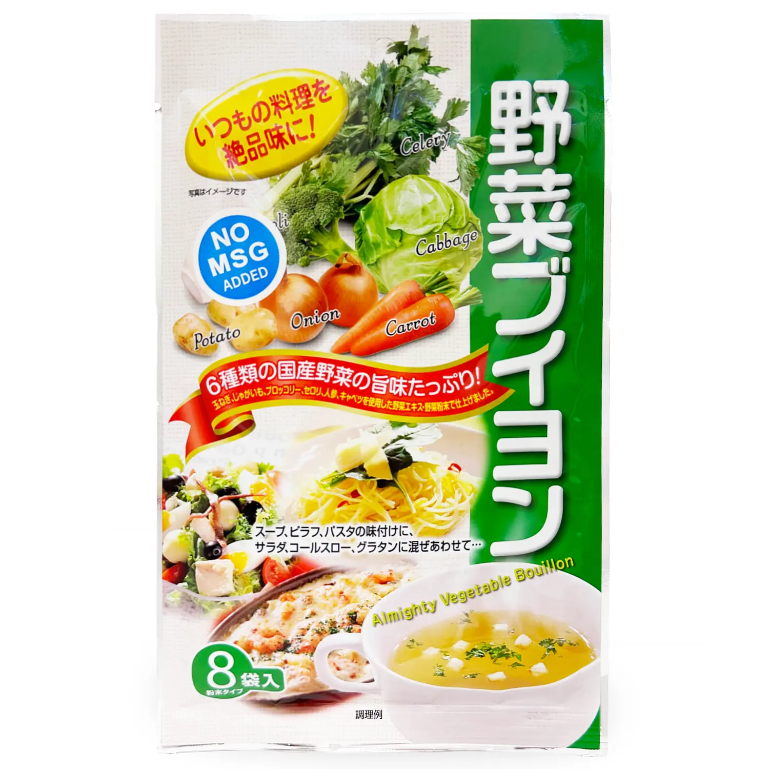 This delicious all-purpose Western-style bouillon is made from six kinds of vegetables (onion, cabbage, carrot, potato, celery, and broccoli) grown in Japan, without using any animal ingredients or chemical seasonings. The gentle flavor of the vegetables brings out the true flavor of the ingredients. Just by adding it to your regular dishes, you can create a different and exquisite taste.