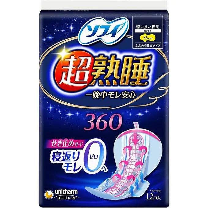 UNICHARM SOFY Wide Guard Overnight Sanitary Napkin with Wings has a 2X larger back to provide better coverage for our best overnight protection. The leakguard core absorbs in seconds for up to 10 hours of protection. The Wide Guard overnight sanitary napkin is for extra heavy overnight padding with flexible wings and larger back. #36cm