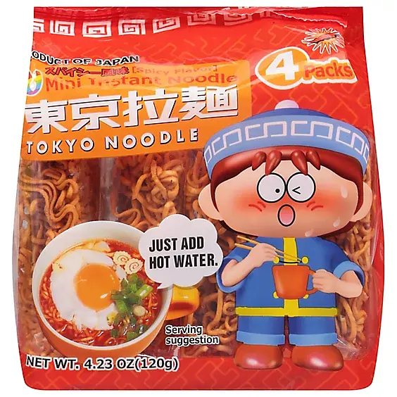 Tokyo Noodle Mini Spicy Flavor Instant Noodle is a convenient meal option that requires only the addition of hot water. It is a product of Japan, capturing the essence of traditional Japanese flavors in a quick and easy-to-prepare format. Each pack contains four individual servings, making it suitable for multiple occasions or for sharing. Enjoy a taste of Japan with the spicy kick that these instant noodles have to offer.
